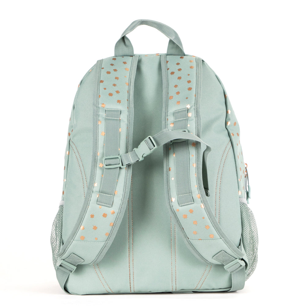 Apportez une touche d'éclat et de charme à votre quotidien avec le sac à dos Lula Clover Foil. Sa base sauge et ses accents de trèfle métallisés en font un sac à dos élégant, à la fois joli et pratique. Doté d'un compartiment principal spacieux, de poches latérales en filet et de bretelles rembourrées, il est idéal pour les aventures quotidiennes ou les journées d'école.